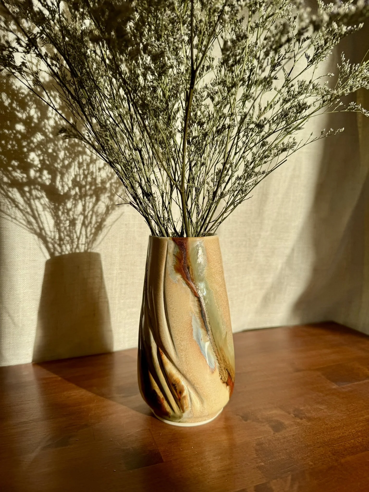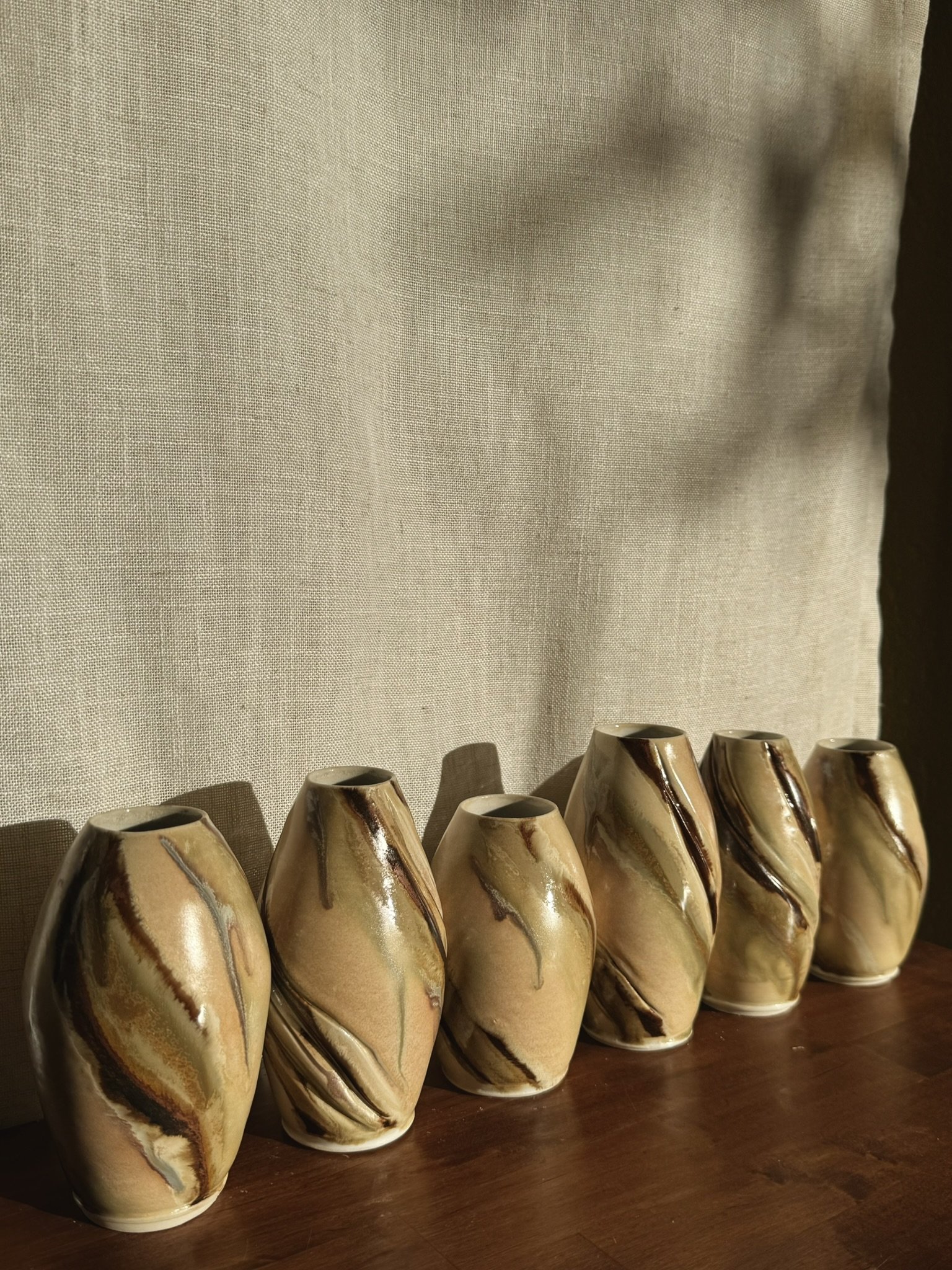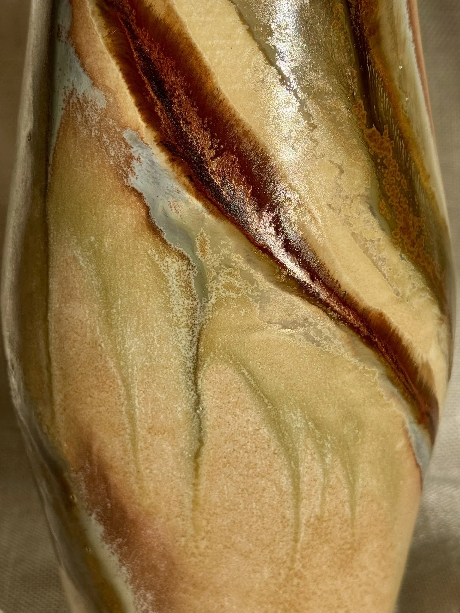 Growing up in the Bay Area, and then spending time in Australia as an adult, I’ve always been drawn to the twisting, peeling, colorful bark of eucalyptus trees. I spent many dog walks through Golden Gate Park planning how to represent the effect in glaze.